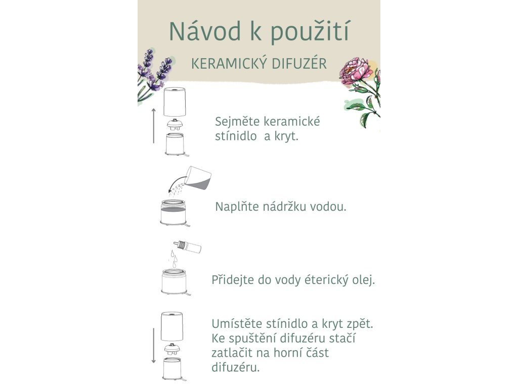 Naplňte vnitřní nádobku vodou nebo hydrolátem (pravou květovou vodou) a přidejte 5-15 kapek vybraného 100% přírodního éterického oleje nebo směsi éterických olejů. Difuzér uzavřete a přístroj zapněte podle návodu. Do difuzéru nepatří rostlinné oleje. Podrobný návod k použití a čištění zařízení je součástí difuzéru.